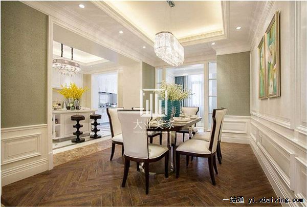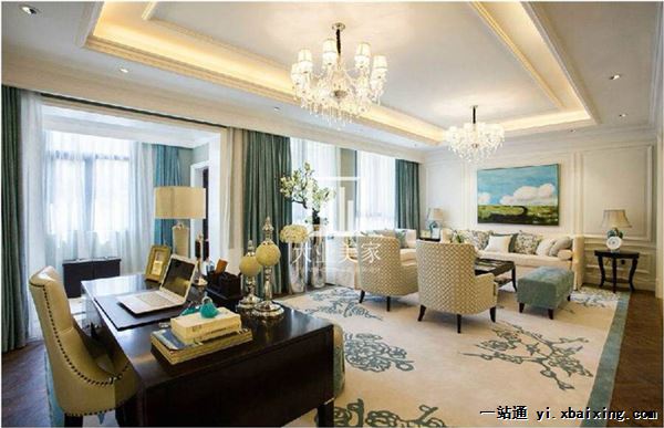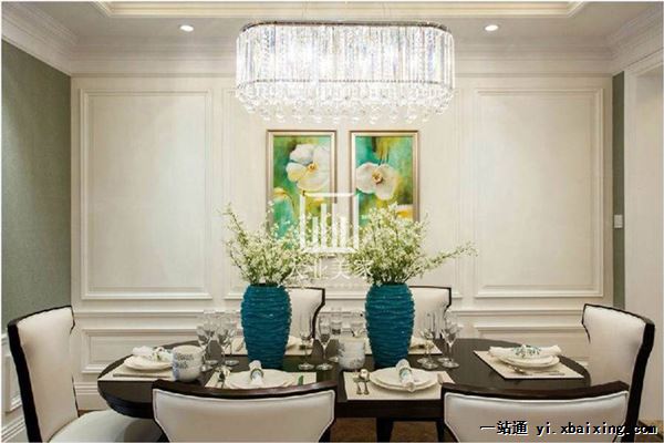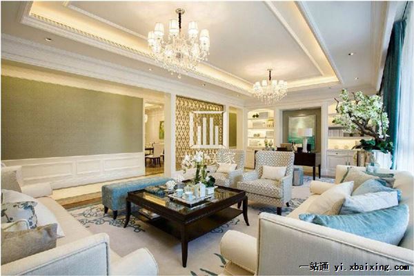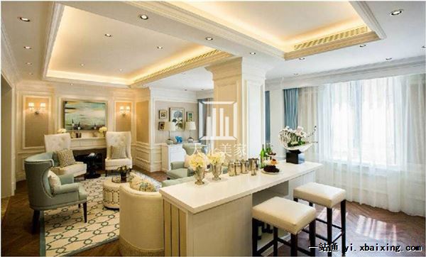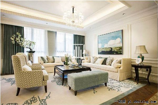 美国是一个移民国家,而且最初的移民大多来自欧洲各国,所以美式风格较多的延续了欧式风格的特点,但是因地理条件以及生活习惯的不同,美式并没有延续欧式风格中的繁琐与富丽感。本案运用有着显著的欧式风格特点的石膏花线条结合时尚都市感的布艺沙发打造了一个清新优雅又舒适的家居环境。