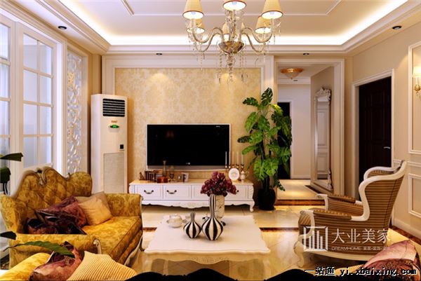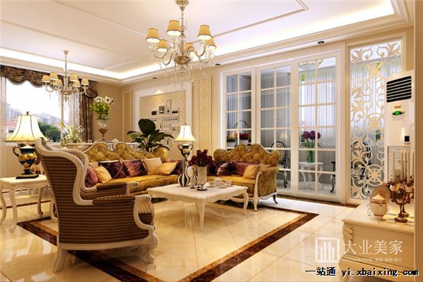 客厅主要强调线形流动的变化,将室内雕刻工艺集中在装饰和陈设艺术上,色彩华丽且用暖色调加以协调,变形的直线与曲线相互作用以及家具与装饰工艺的运用,构成室内华美厚重的气氛。它在形式上以浪漫主义为基础,运用大理石、华丽多彩的织物。精美的地毯、多姿曲线的家具,让室内显示出豪华、富丽的特点,充满强烈的动感效果。